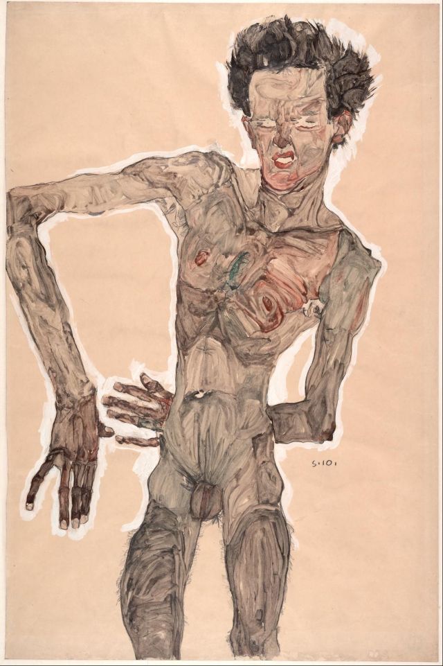 Šile autoportrete nije koristio za veličanje sebe - naprotiv koristio ih je za razotkrivanje unutrašnje istine. Izobličene linije koje stvaraju neproporcionalne figure čine ove autoprtrete upečatljivim. Šile je na poseban način gledao na ljudsko telo, ono nije objekat već subjekat sam za sebe. Autoprtreti su mahom bili muški aktovi, što je takođe bilo kontraverzno i neobično u trenutku njihovog stvaranja. Slika “Nude Self-Portrait, Grimacing” naslikana je 1910. godine. Vidimo slikara u nagoj zgrčenoj pozi, sa podignutom rukom i natečenim stomakom. Lice je iskrivljeno od bola, sa podignutim obrvama i širo otvorenim ustima. Grimasa i položaj tela su direktno povezani. Oni nisu samo odraz fizičkog stanja, već nam Šile prikazuje sirovo, psihološko stanje iznutra. Pozadina je jednostavna i stavlja ceo fokus na figuru. Tonovi su topli, sa ponekim potezima crvene i zelene boje koji pridodaju napetosti scene. Uočavamo prepoznatljivu Šileovu liniju - iako pravi neproporcionalnu, izobličenu figuru ona je oštra i tačna. Slika ne traži odobravanje i razumevanje, ona je iskrena, neprijatna i neuredna. Tera nas da se suočimo sa bolom koji nam nedvosmisleno i sirovo prikazuje. Tera nas da u ogledalu sagledamo više od fizičkog, i odemo dublje. Odemo unutra. Egon Šile radikalno i hrabro nas pušta dublje, da zavirimo u neispolirane slojeve njegovog bića.